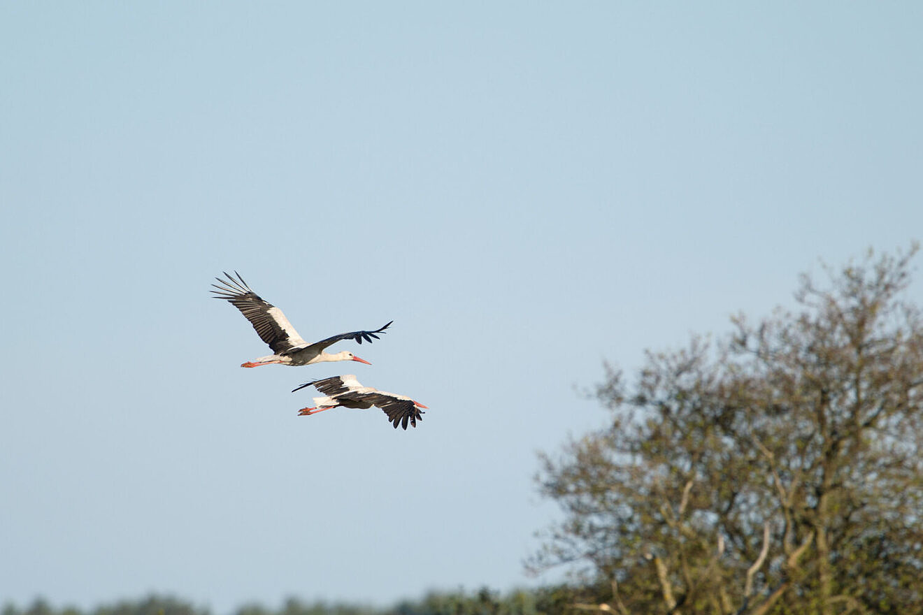På bilden ser vi två vita storkar som flyger över det bohuslänska jordbrukslandskapet. Foto: Ingemar Pettersson